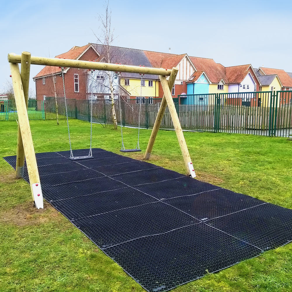 Playground mats are a recycled rubber safety surface used around the UK by councils, schools, stable owners and general domestic users. They protect the ground from becoming churned up which can create a boggy and muddy mess. Playground Mats are commonly used in children’s play areas but also to protect your lawns, garden play areas and for equestrian access as these places tend to be prone to becoming boggy due continual use from pets, horses and children.